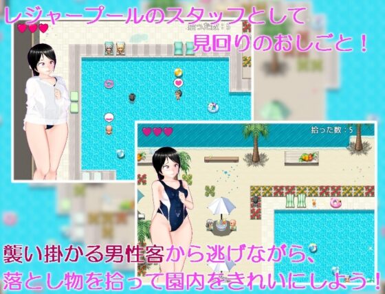 レジャープールのスタッフとして、 発見するなり襲ってくる男性客から逃げつつ園内の落とし物を拾うお仕事をする、 前作と同様シンプルなゲーム内容です。 男性客に捕まってしまうとHなイタズラを受けてしまいます。 セクハラ、中〇し、輪〇、強○ご奉仕等・・・ 多様なシチュエーションでスタッフを虐めてきます。 今作の登場キャラは4人。 貧乳、巨乳、競泳水着、ビキニなど・・・ 好きなキャラでプレイできます。 前作よりもクオリティが上がったぬるぬるHアニメーションは 衣装差分、キャラ差分を含め約700本! (基本69パターン) 一度見たHアニメは自由に閲覧できます。 ※ストーリー要素は無く、前作との関連性はありません。 ※ゲーム難易度は低めですが、 忙しい方向けに全Hアニメを解放するチートコマンドも用意しています。サンプル