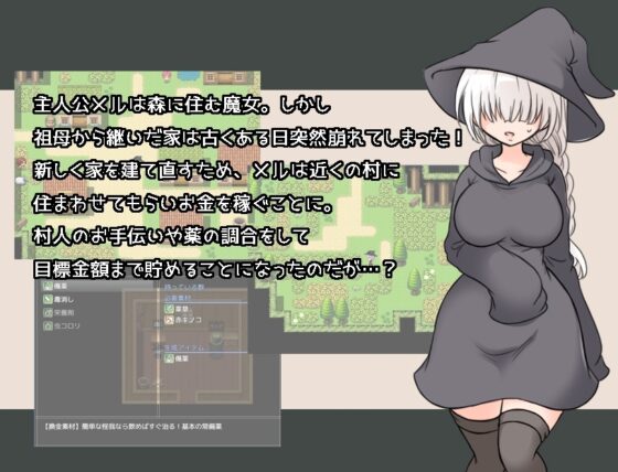 主人公のメルは森に1人で住む魔女。 しかし突然古い自宅が壊れてしまう、 これは建て直した方がいいと言われ費用を稼ぐため 一時的に近くの村へ住むことになったのだが 何も知らない魔女は、そのスケベな体で 無自覚に村の男たちを惑わす… 小さな村に住み着いた魔女が、 薬を作ったりバイトをしたりして お金を稼ぐだけの簡単な短編ゲームです。 ◆女主人公のセクハラ売春物 ◆戦闘は無し ◆エロシチュはセクハラと挿入、相手は中年以上のモブ男のみ ◆基本CG6枚 ◆プレイ時間:15分~30分程度サンプル